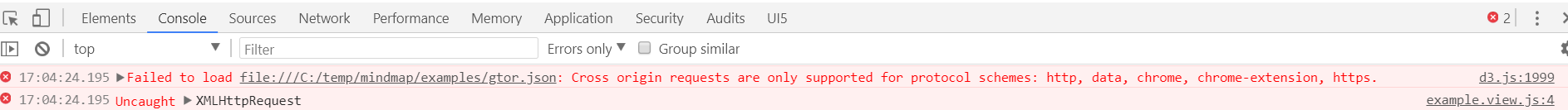 如果直接双击examples文件夹里的index.html文件在浏览器里打开,会出现跨域错误导致本地文件gtor.json无法访问: