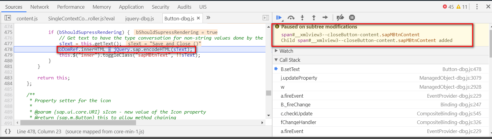 一秒钟之后,断点会自动触发,停留在该元素的innerHTML发生变化的代码位置。从代码478我们得知,UI上按钮的文字能够刷新,是因为其dom元素的innerHTML属性被修改的缘故。