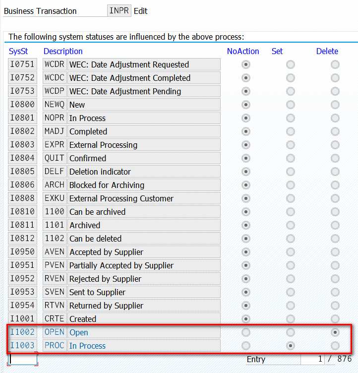 得到Business Transaction INPR的如下follow-up actions列表。下图意思是,一旦用户在UI上选择了In Process这个User Status(E0002 ),那么这个订单的System Status会被置为I1003,因为下图I1003对应的Set列被置位,而Delete处于非置位状态。