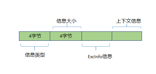 异常上下文存储区域的详细分布如下图所示,保存异常信息类型和信息大小,然后分别存储ExcInfo和上下文信息。其他异常信息类似,不再提供。