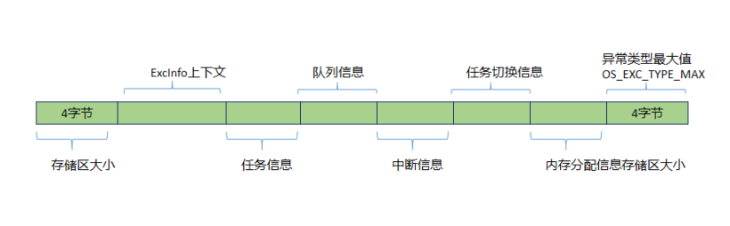 在文件components\exchook\los_exc_info.h定义了异常信息的相关宏定义、枚举和结构体。如下所示的宏定义为各种异常信息的大小,可以参考下面的异常信息存储区域分布图进行直观的理解,前4字节保存异常信息存储区域的大小,然后分别是异常上下文、任务、队列,中断寄存器,任务切换,内存分配情况的数据信息,最后4字节保存的是异常类型的最大值。