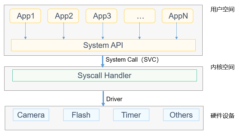 OpenHarmony LiteOS-A内核实现态与内核态的区分隔离,用户态程序不能直接访问内核资源,而系统调用则为用户态程序提供了一种访问内核资源、与内核进行交互的通道。如下图所示,用户程序通过调用System API(系统API,通常是系统提供的POSIX接口)进行内核资源访问与交互请求,POSIX接口内部会触发SVC/SWI异常,完成系统从用户态到内核态的切换,然后对接到内核的Syscall Handler(系统调用统一处理接口)进行参数解析,最终分发至具体的内核处理函数。