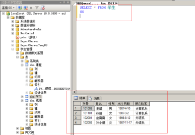 以系统管理员身份登录到SQL Server 2008管理平台主界面。在对象资源管理器中,展开“数据库”,选中“学生管理”数据库,右击,在弹出的快捷菜单中选择“新建查询”选项,打开查询编辑器。在查询编辑器的输入窗口输入如下语句: