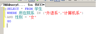 select * from 学生 where 所在院系 in (‘外语系’,’计算机系’) and 性别=’女’