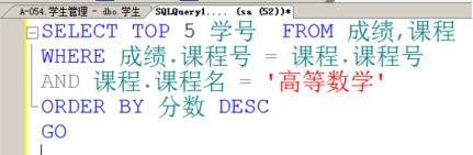 - 查询选修数据库的学生的学号,并按照分数从高到低输出前5名。