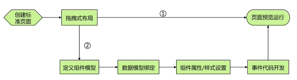 标准页面的一般开发流程,主要包含页面布局、组件模型、数据绑定以及事件编排等。标准页面是通过平台预置的基础组件或模板快速拖拽式开发的一种方式,主要用于表格、表单类的后端管理页面,当不满足要求时也可以通过自定义组件进行扩展。基于模型驱动的标准页面开发流程图如下:
