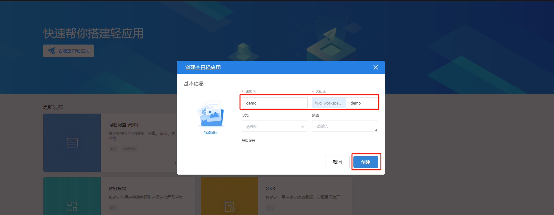 4、输入标签和名称点击创建