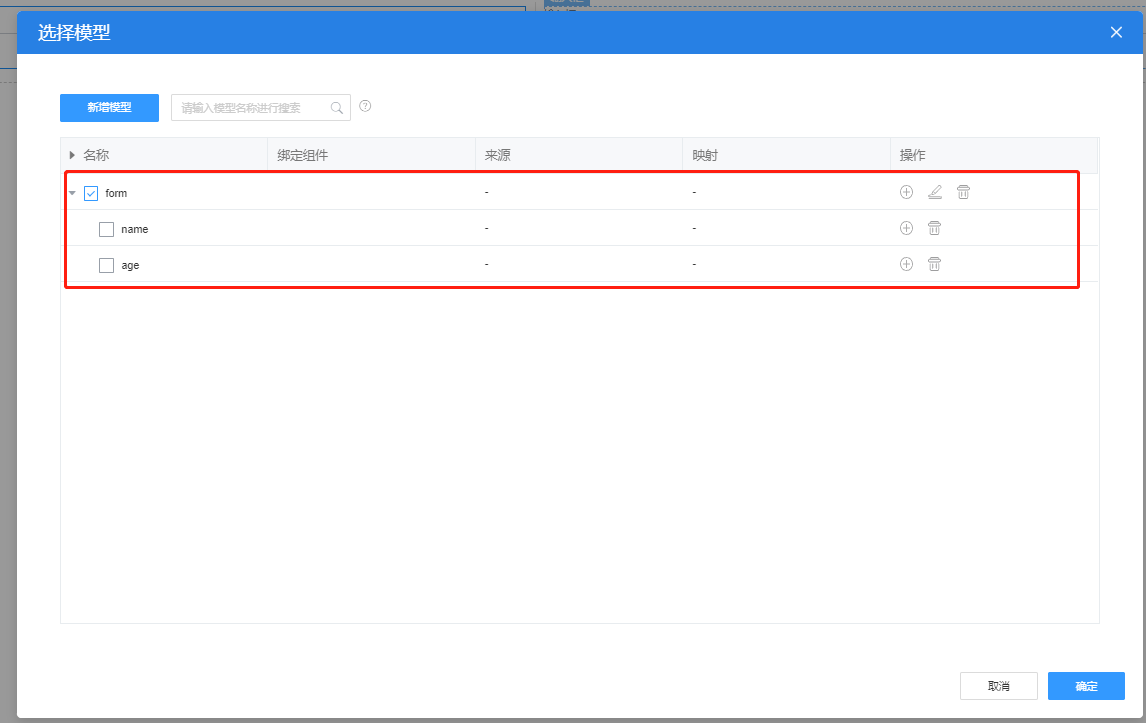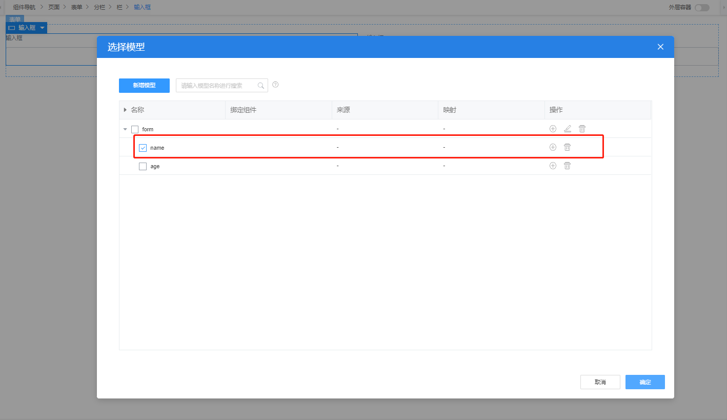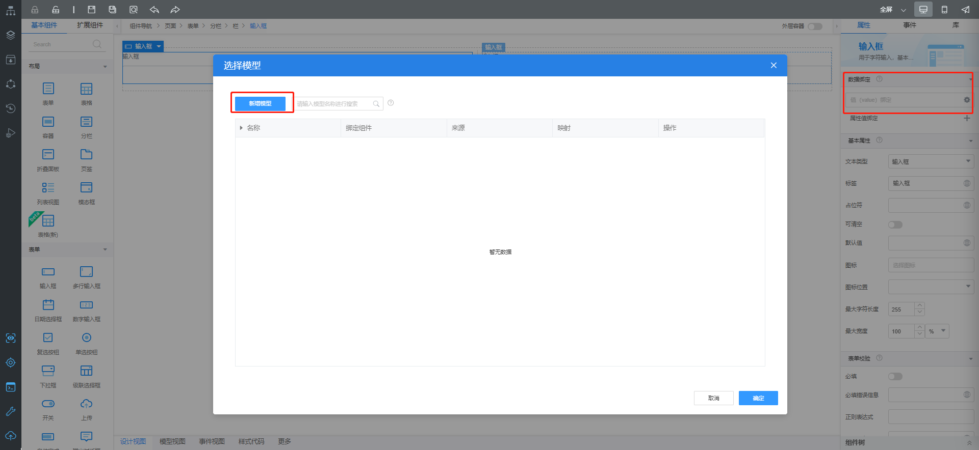 7、可以对组件进行数据绑定,选中表单组件,进入数据绑定页面,点新增模型