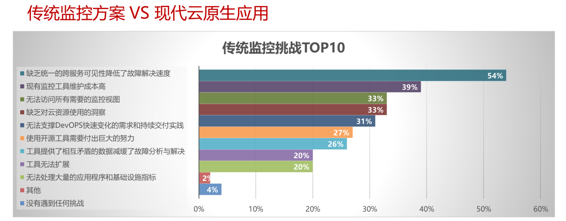 云原生应用的复杂度增加了系统状态可视化的难度,企业对于系统可观测能力提出更高的要求。根据CNCF 对近2400名CNCF 成员的调查,对于采用新的云原生架构的开发运维团队而言,他们最关心的问题是监控和可观测性。云原生时代可观测性变成了基础设施级的诉求。