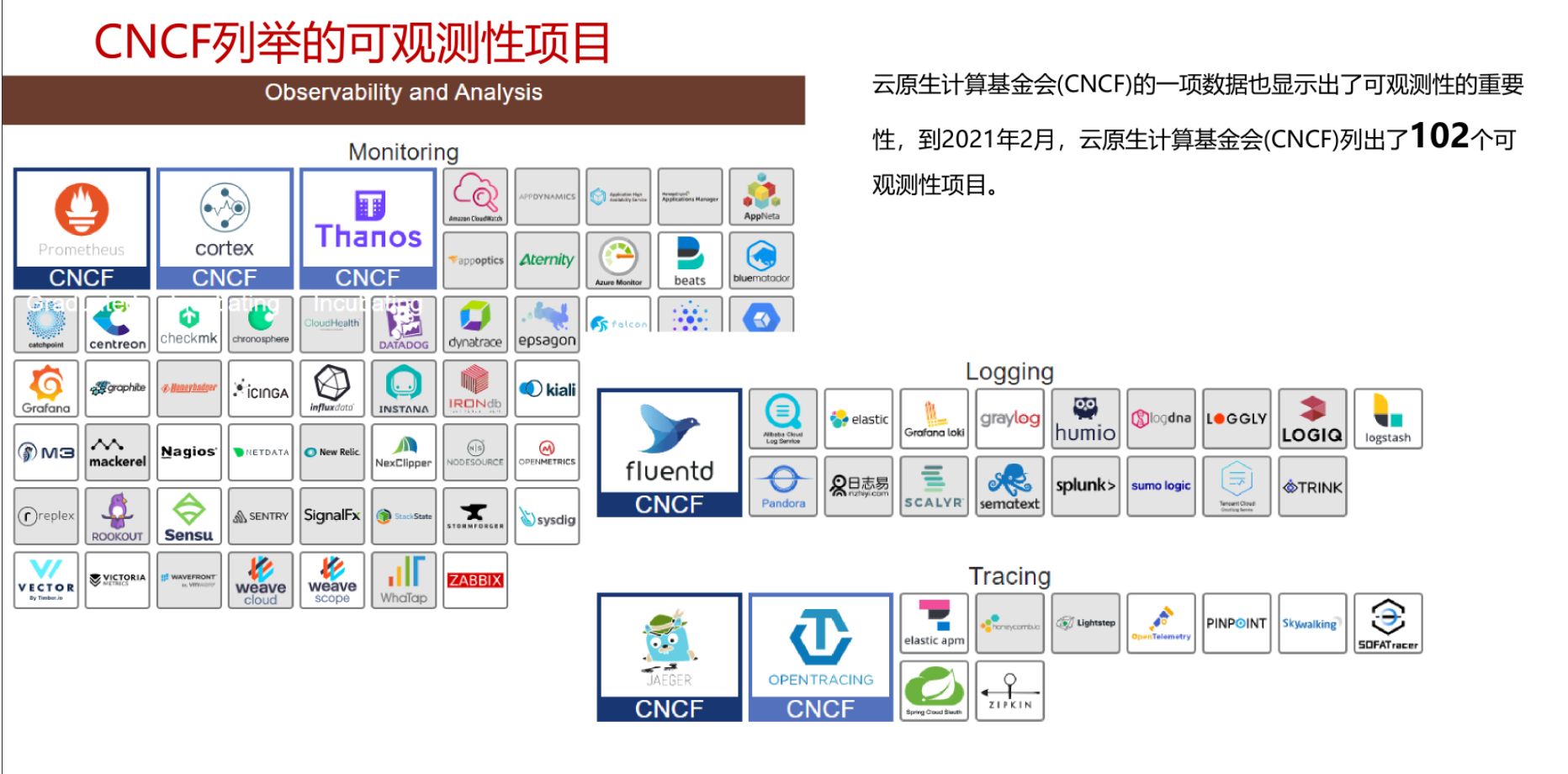 云原生计算基金会(CNCF)的一项数据也显示出了可观测性的重要性,到2021年2月,云原生计算基金会(CNCF)列出了102个可观测性项目。