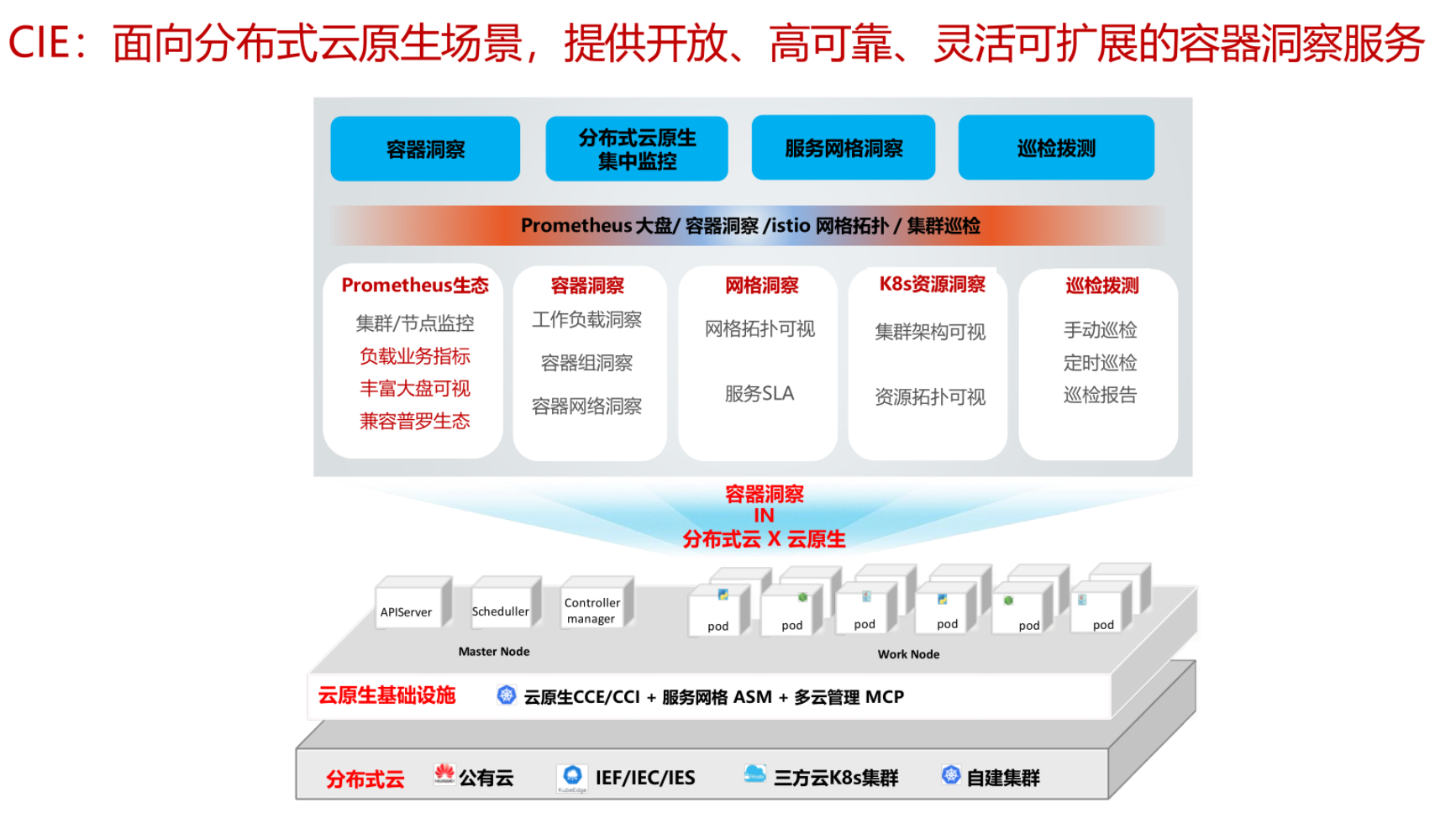 容器洞察引擎(Container Insight Engine,CIE)是面向云原生和分布式云场景,提供容器可观测性的服务。CIE提供全托管的多云多集群普罗监控、容器洞察、istio网格洞察、容器网络洞察和集群巡检等能力,完全兼容云原生监控生态,具备开箱即用和开放生态等特性。