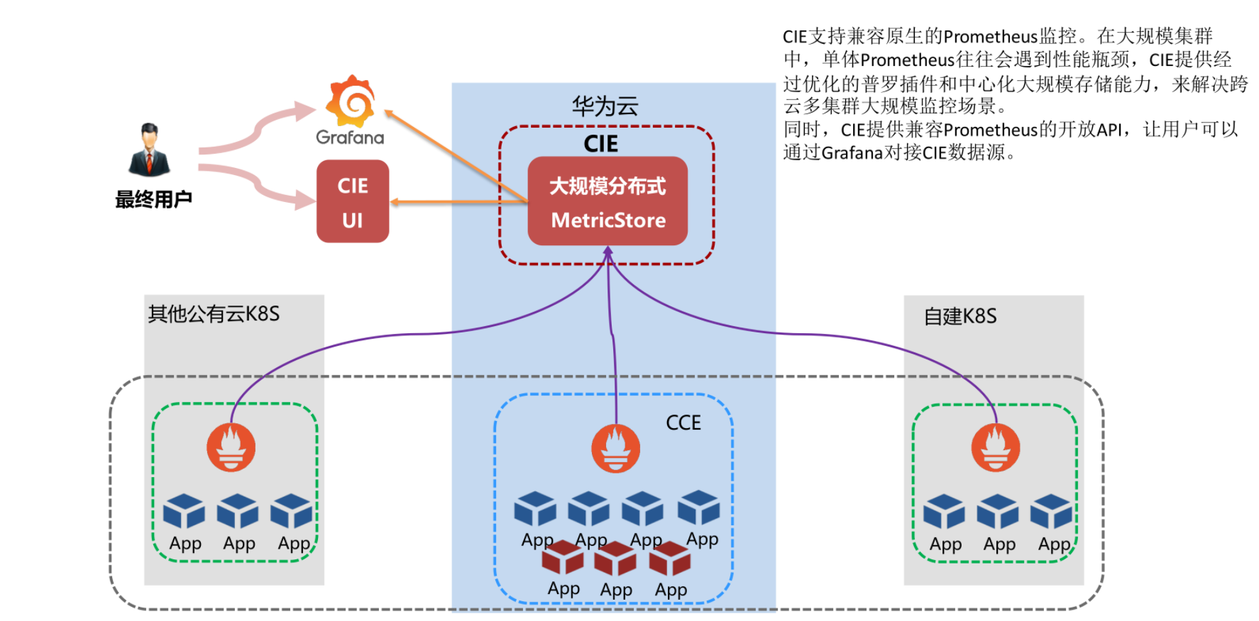 CIE支持兼容原生的Prometheus监控。在大规模集群中,单体Prometheus往往会遇到性能瓶颈,CIE提供经过优化的普罗插件和中心化大规模存储能力,来解决跨云多集群大规模监控场景。