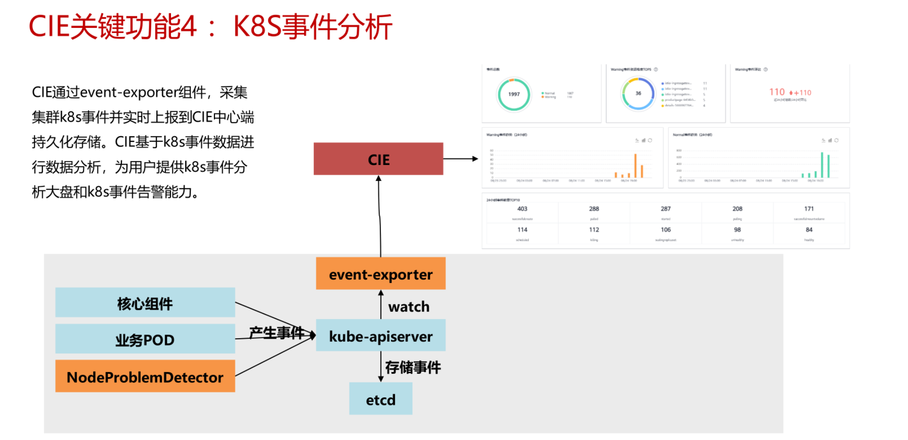 CIE通过event-exporter组件,采集集群k8s事件并实时上报到CIE中心端持久化存储。CIE基于k8s事件数据进行数据分析,为用户提供k8s事件分析大盘和k8s事件告警能力。