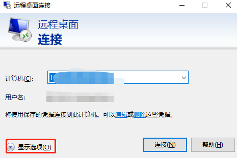 1、点开远程桌面连接的对话框,在对话框的左下角找到“显示选项”点开它。