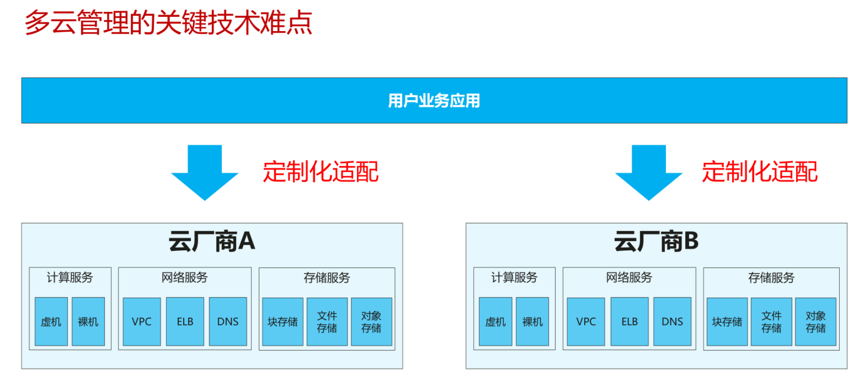 多云管理的关键技术难点,应用管理和资源管理割裂,不同云厂商提供的云服务接口各不相同,需要用户业务分别做适配,导致多云管理方案极为复杂,几乎不可能实现。