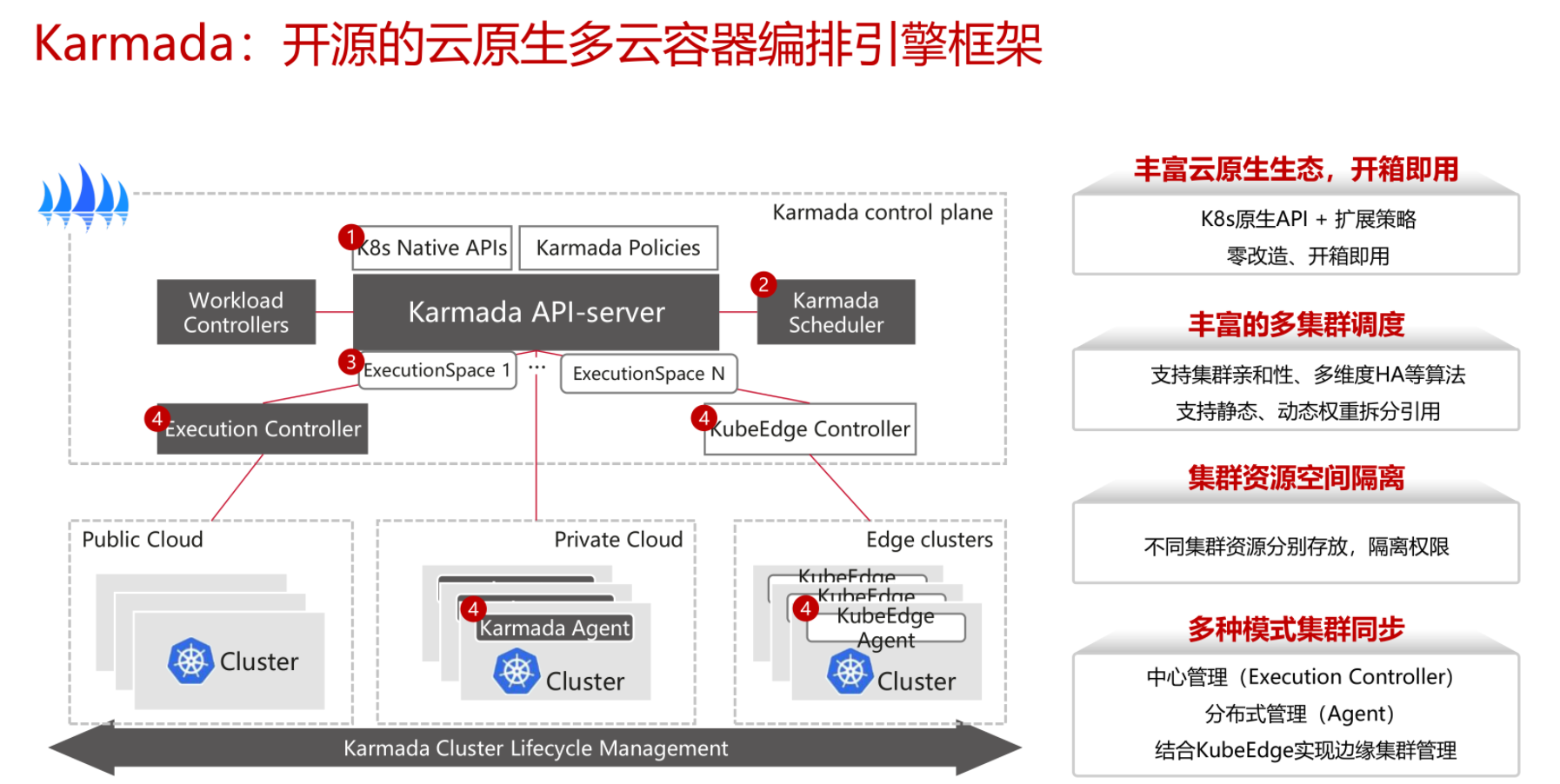 中心管理(Execution Controller);分布式管理(Agent);结合KubeEdge实现边缘集群管理