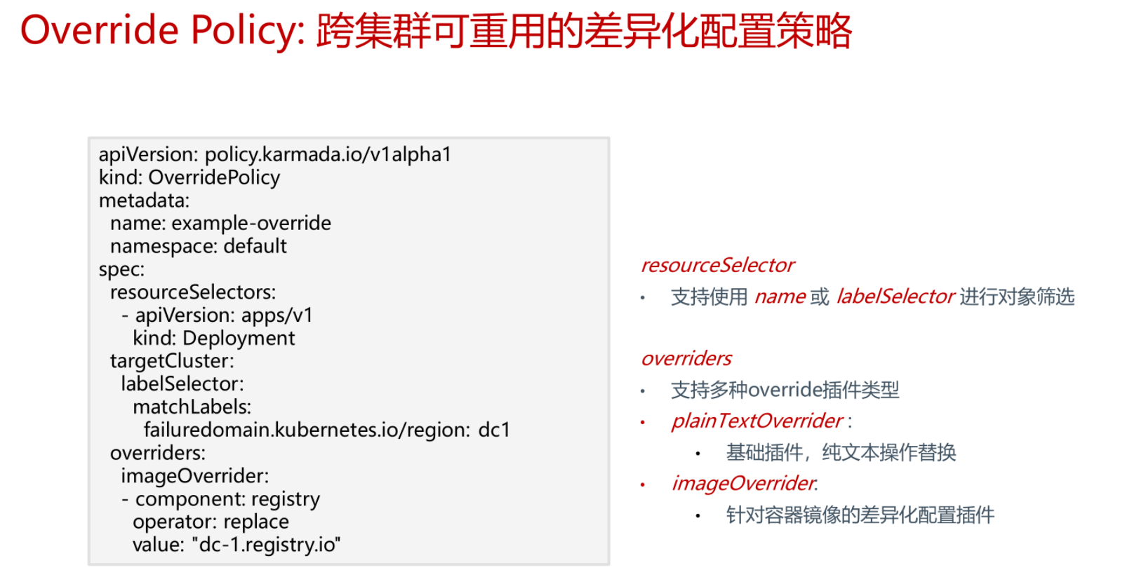- 差异化策略(Override Policy):Karmada提供独立的差异化API,用来配置与集群相关的差异化配置。比如配置不同集群使用不同的镜像。