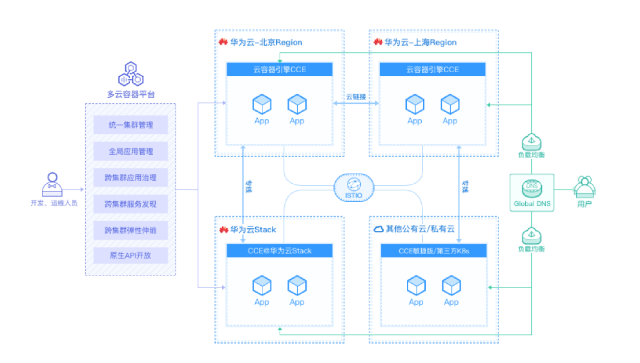 - 多区域容灾:相同业务部署到华为云不同区域的集群,实现多云容灾。