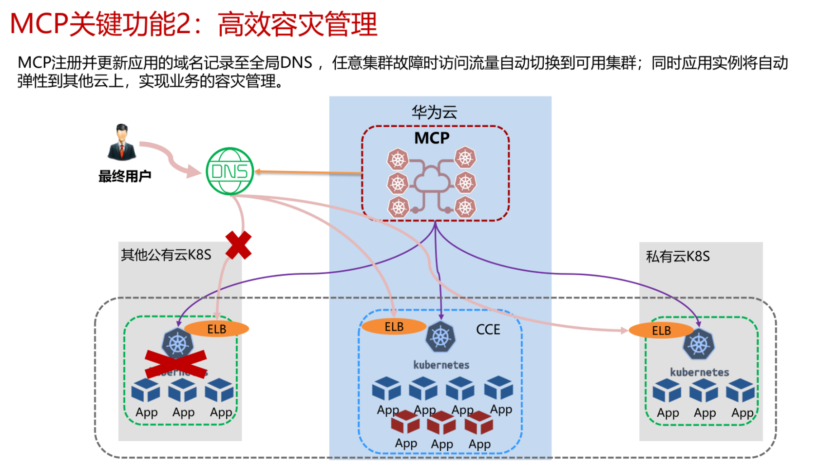 MCP注册并更新应用的域名记录至全局DNS,任意集群故障时访问流量自动切换到可用集群;同时应用实例将自动弹性到其他云上,实现业务的容灾管理。