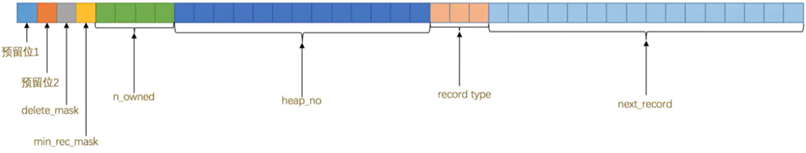 | min_rec_mask | 1 | B+树的每层非叶子节点中的最小记录都会添加该标记 (只有目录项_非叶子节点存储此信息 1 表示,其它是0) |