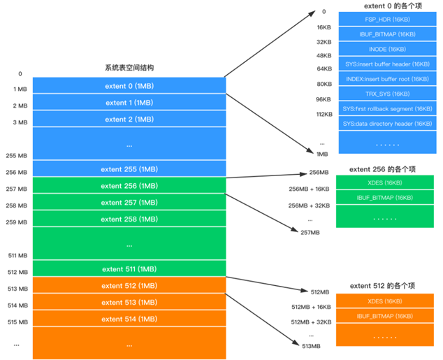 系统表空间与独立表空间的一个非常明显的不同之处就是在表空间开头有许多记录整个系统属性的页面,示意图如下: