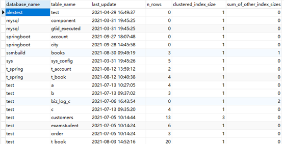 innodb_table_stats 存储表的统计数据,每条记录对应一个表统计数据