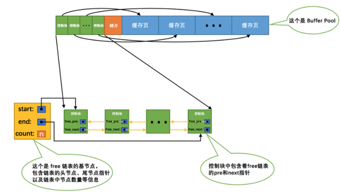 Pool中哪些缓存页是可用的,我们可以把所有空闲的缓存页对应的控制块作为一个节点放到一个链表中,这个链表也可以被称作free链表(或者说空闲链表)。