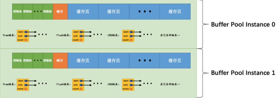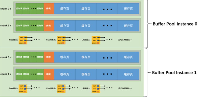 上图代表的Buffer Pool就是由2个实例组成的,每个实例中又包含2个chunk。