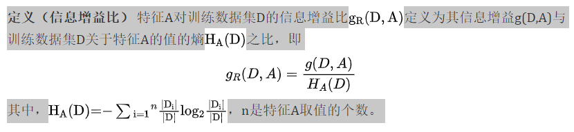 以信息增益作为划分训练数据集的特征,存在偏向于选择取值较多的特征的问题。使用信息增益比可以对这一问题进行校正。这是特征选择的另一准则。