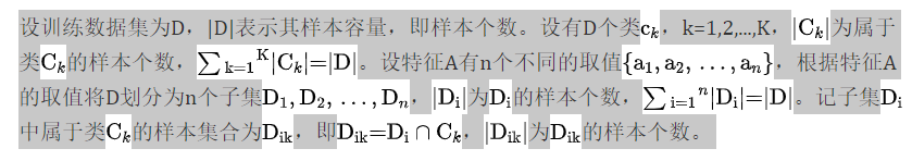 根据信息增益准则的特征选择方法是:对训练数据集(或子集)D,计算其每个特征的信息增益,并比较它们的大小,选择信息增益最大的特征。