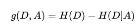 定义(信息增益) 特征A对训练数据集D的信息增益g(D,A),定义为集合D的经验熵H(D)与特征A给定条件下D的经验条件熵H(D|A)之差,即