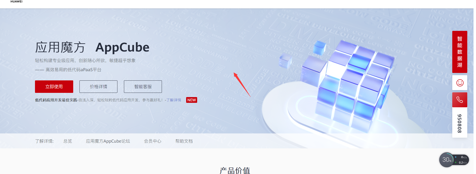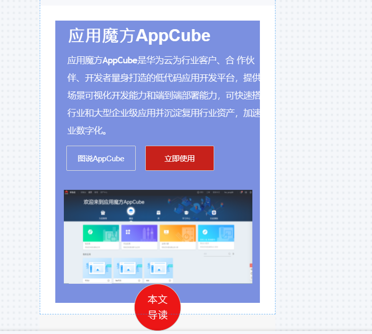 1、AppCube应用魔方是华为云推出的低代码开发平台,适用它可以有助于我们更加方便快捷的完成页面的开发,AppCube的访问地址为:https://www.huaweicloud.cn/product/appcube.html