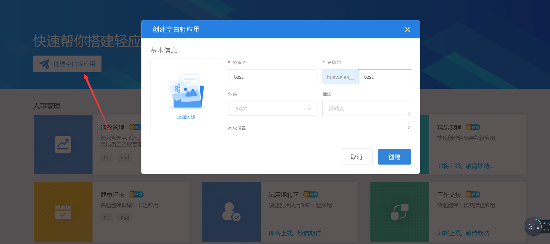 然后点击轻应用, 选择创建空白轻应用,再任意命名一下即可简单创建一个应用