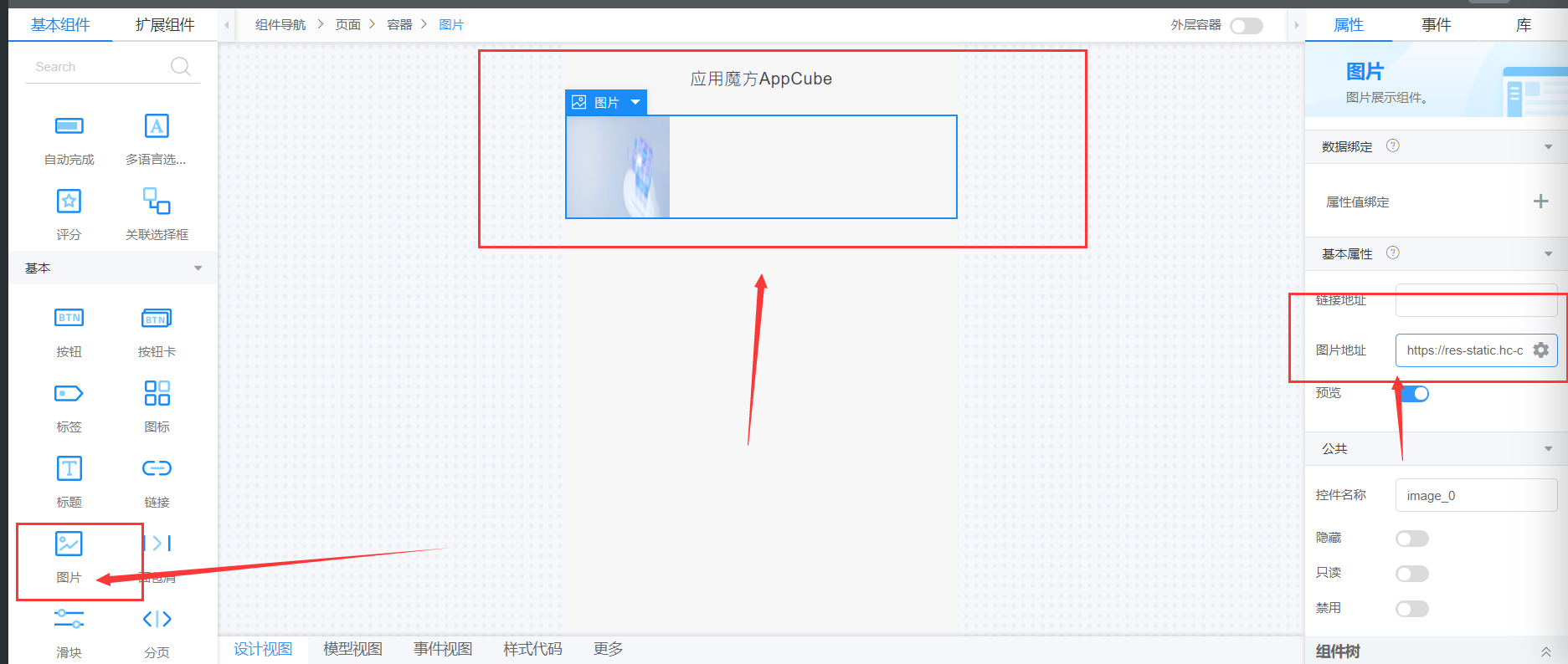 然后简单的拖入两个容器,呈现上下结构,第一个容器先拖入一个标题:应用魔方AppCube,标题下面的样式代码