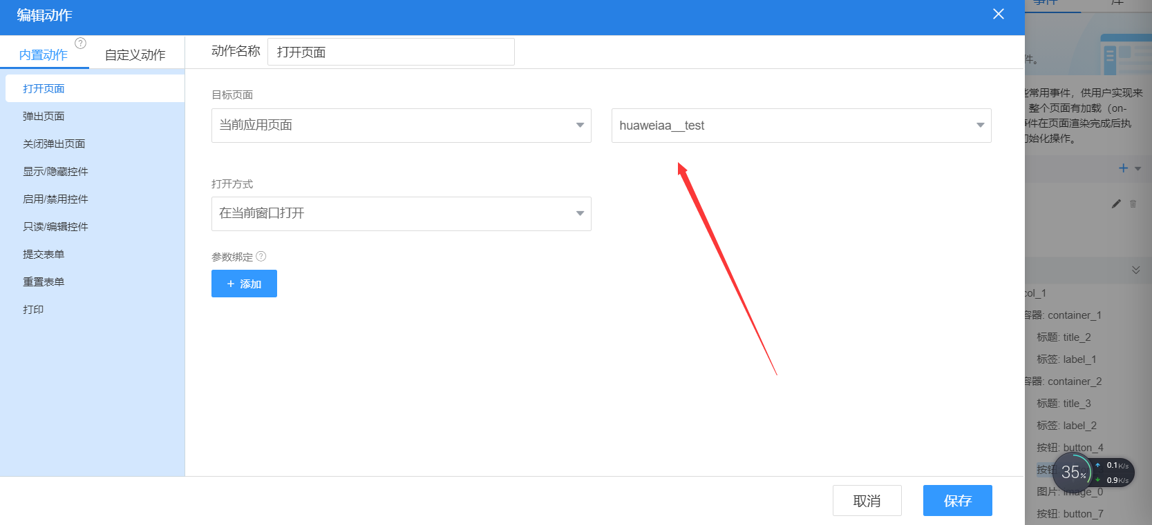 然后选择当前应用页面,选择创建的第二个页面,当前窗口打开,点保存即可。