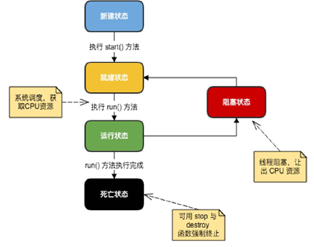 线程是一个动态执行的过程,它也有一个从产生到死亡的过程。下图显示的是线程的生命周期:
