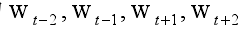 ,即需要模型预测的词向量,那么窗口内的词有 4 个,目标词前后各 2 个,分别为