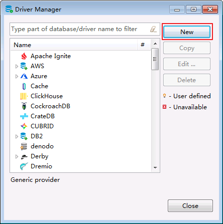 Database->DriverManager,在弹出的对话框中点击 New.