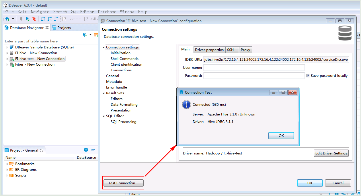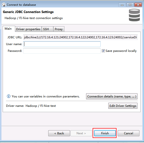 新建的连接名字为FI-hive-test,连接信息如下,完成后点击OK