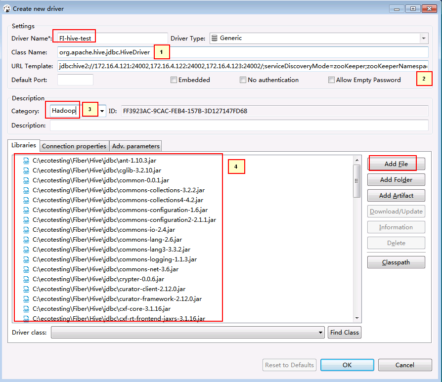 1. org.apache.hive.jdbc.HiveDriver 2. jdbc:hive2://172.16.4.121:24002,172.16.4.122:24002,172.16.4.123:24002/;serviceDiscoveryMode=zooKeeper;zooKeeperNamespace=hiveserver2;sasl.qop=auth-conf;auth=KERBEROS;principal=hive/hadoop.hadoop.com@HADOOP.COM 3. Hadoop 4. 点Add File在下载好的hive客户端lib中把所有jar包加进去