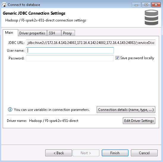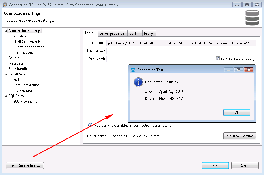 新建的连接名字为FI-spark2x-651-direct,连接信息如下,完成后点击OK