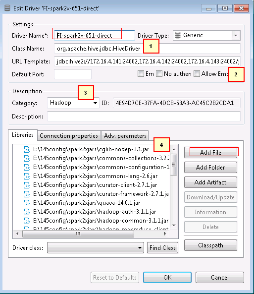 1. org.apache.hive.jdbc.HiveDriver 2. jdbc:hive2://172.16.4.141:24002,172.16.4.142:24002,172.16.4.143:24002/;serviceDiscoveryMode=zooKeeper;zooKeeperNamespace=sparkthriftserver2x;saslQop=auth-conf;auth=KERBEROS;principal=spark2x/hadoop.hadoop.com@HADOOP.COM;user.principal=developuser;user.keytab=E:/145config/user.keytab 3. Hadoop 4. 点Add File在上述步骤配置好的spark2x连接所有jar包加进去注意:连接url的user.principal=developuser;user.keytab=E:/145config/user.keytab这两个参数必须加上,并且保证正确