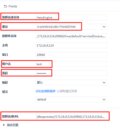- 数据连接URL:jdbc:presto://172.16.9.114:29860,172.16.9.116:29860/hive/default?serviceDiscoveryMode=hsbroker