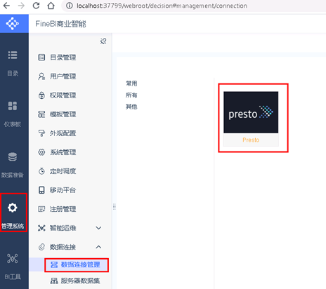 - 在FineBI工作页面,依次单击“管理系统”—>“数据连接”—>“数据连接管理”—>“新建数据连接”—>“所有”—>“presto”,进入创建数据连接页面。