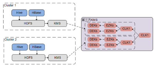 • 一套FusionInsight Manager内部署一个KMS服务,KMS服务到第三方KMS使用公私钥认证,每个KMS服务在第三方KMS对应拥有一个CLK。