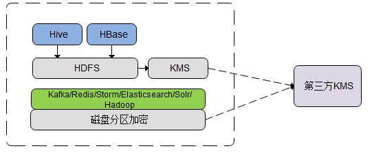 • HDFS支持透明加密,Hive、HBase等在HDFS保存数据的上层组件也将通过HDFS加密保护,加密密钥通过HadoopKMS从第三方KMS获取。