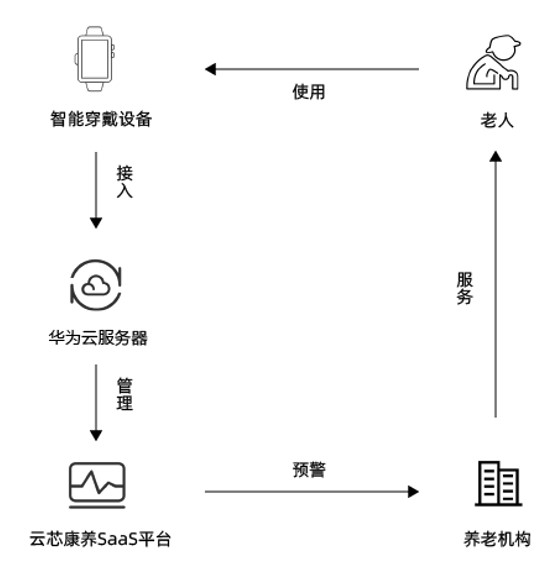 华为云为云芯在康养行业的200+款硬件设备提供底层系统、数据存储等能力。举个例子,云芯通过老人佩戴的智能穿戴设备传输健康检测数据到华为云服务器,从而根据检测数据分析、对比、存储,并得到相应的解决方案,让老人可以实时了解身体健康状态,节省去医院检查的费用和时间,提高养老机构以及家庭养老的便利性。