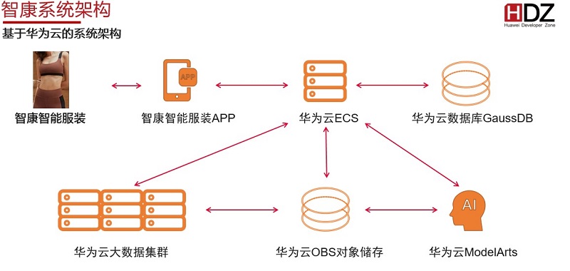 如上图所示,基于华为云的智康系统架构首先通过智能服装,采集生命体征数据并上传到手机APP;经过华为云弹性服务器、高斯数据库,OBS对象存储以及大数据集群完成这些体征数据的存储和分析;再通过华为云ModelArts使用这些数据来训练出相关的AI模型,让整个数据分析报告更为精准,最后反馈出数据检测报告回传给用户。