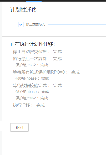 - 勾选“确认已经停止了业务数据写入”,单击“开始迁移”。根据界面提示,等待相关任务完成。如果迁移发生失败,可尝试重试或者放弃迁移任务,放弃后会恢复至迁移前的状态。迁移任务开始后,容灾保护将自动停止,迁移任务已完成或者放弃迁移任务后,如果需要再次建立数据保护关系,请重新建立保护。