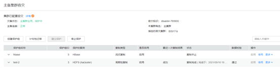 - 等待任务执行完成,查看主备集群容灾页面上的灾备状态为“保护中”。